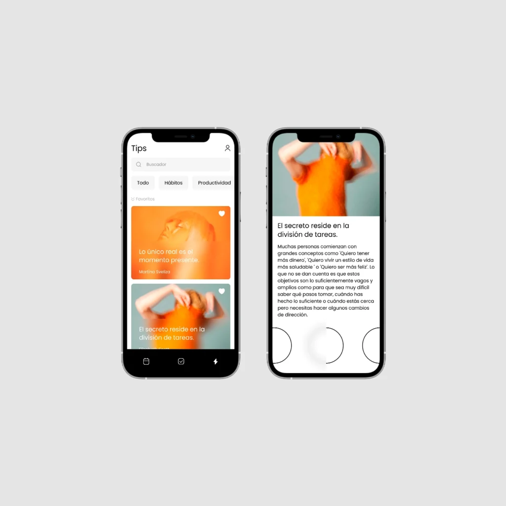 The app includes two organizational tools: a calendar and task management. In both, users can view their task list, while the calendar also allows them to schedule tasks over time, filter them by proximity, and sort them chronologically. Additionally, the app includes an information tool where users can access various articles and tips on a wide range of topics to help improve their quality of life.